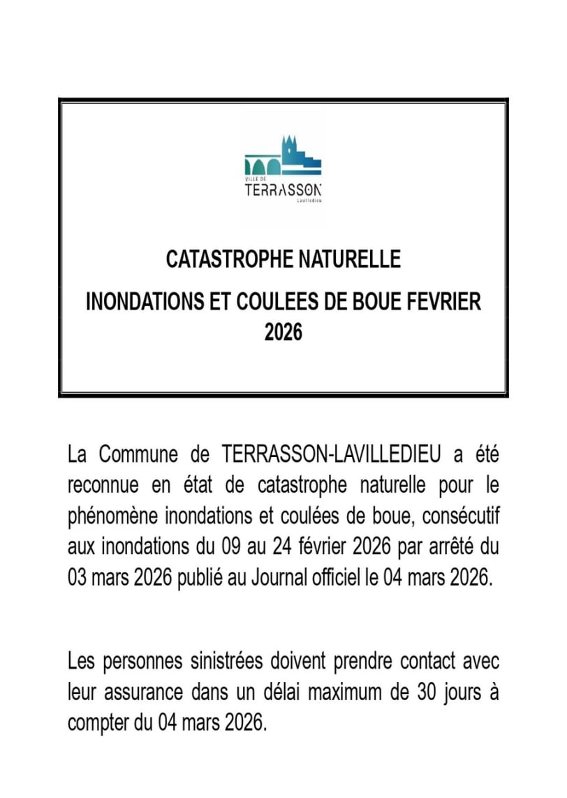 Dans le cadre des inondations survenues du 10 au 20 février 2026, la municipalité de Terrasson-Lavilledieu engage une procédure afin d’obtenir la reconnaissance de l’état de catastrophe naturelle.