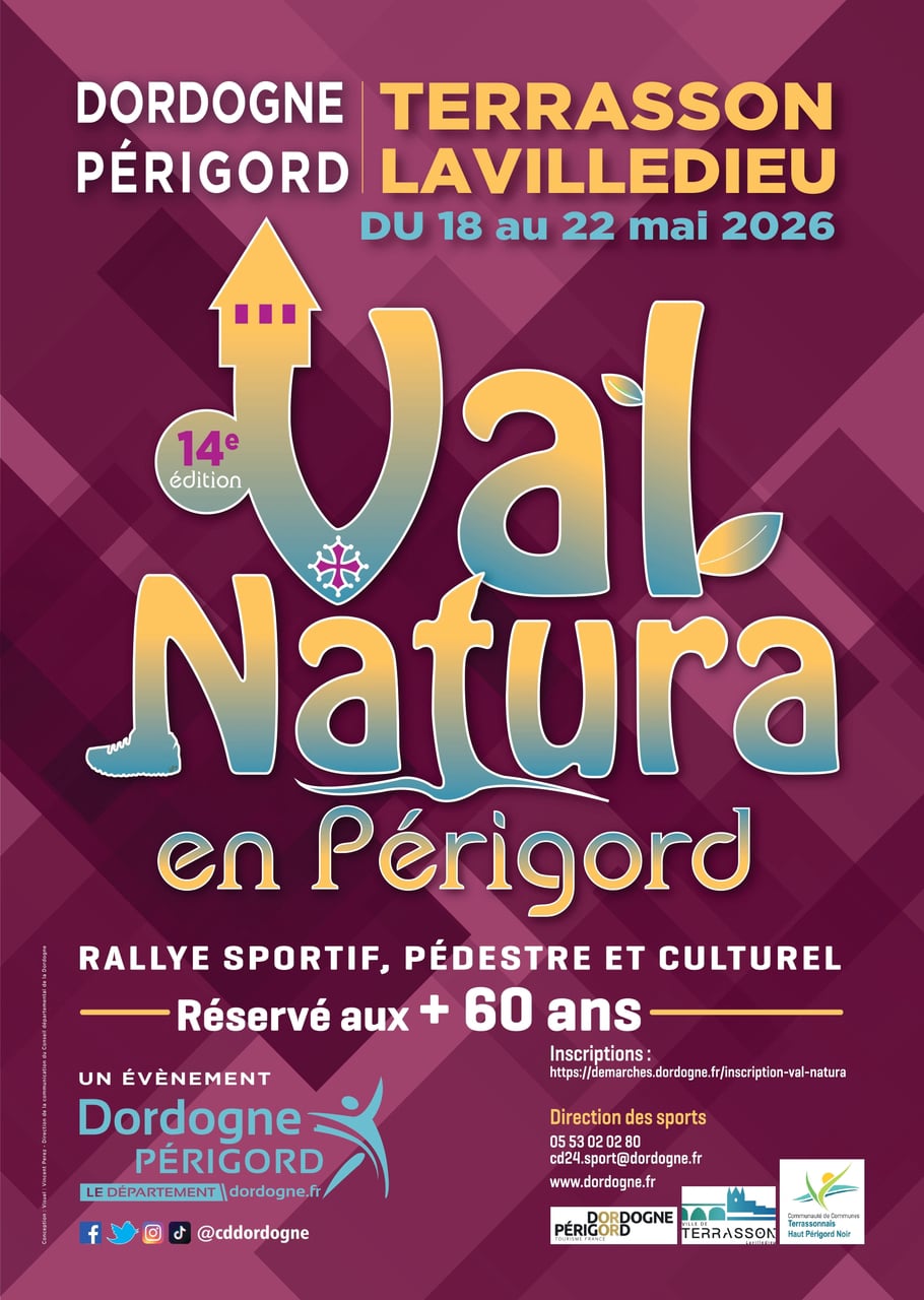 Le Département de la Dordogne organise un rallye sportif et culturel intitulé "Val Natura en Périgord" ouvert aux séniors de toute la France du 18 au 22 mai 2026 sur la commune de Terrasson et ses alentours. Val Natura en Périgord est un rallye nature à dominante pédestre et culturel visant à découvrir une partie du département de la Dordogne, « pays de l’homme », riche d’un patrimoine varié. Ce rallye convivial est réservé aux seniors (+ 60 ans). Il se déroule sur 5 jours, par équipe de 2, avec des étapes sportives adaptées, des découvertes culturelles et des visites de sites exceptionnels.